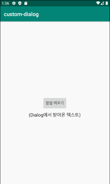 부모 액티비티에서 전달한 텍스트가 다이얼로그에 표시되며, 취소 버튼을 누르면 다이얼로그가 닫힙니다.